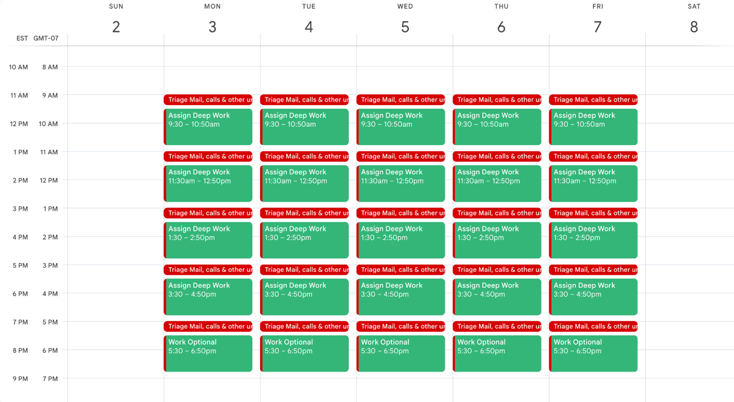 Short, clearly labeled blocks (e.g. “Email + Team Questions”) - Focus blocks